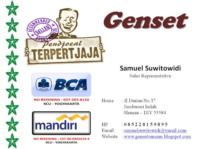 Alangkah baiknya kalau semua orang tahu dimana mendapatkan Genset dari watt yang kecil sampai yang besar, tidak lain dan tidak bukan melalui Pendjoeal Genset Terpertjaja http://gensetomsam.blogspot.com/